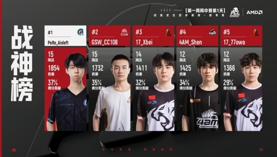 首日赛后,GSW凭借着59的总积分暂居第一,随后是17战队和PeRo战队,战神榜第一名则是给到了PeRo战队的Aixleft。